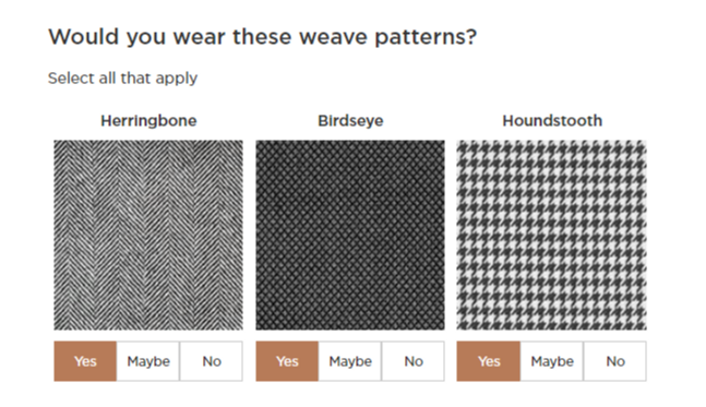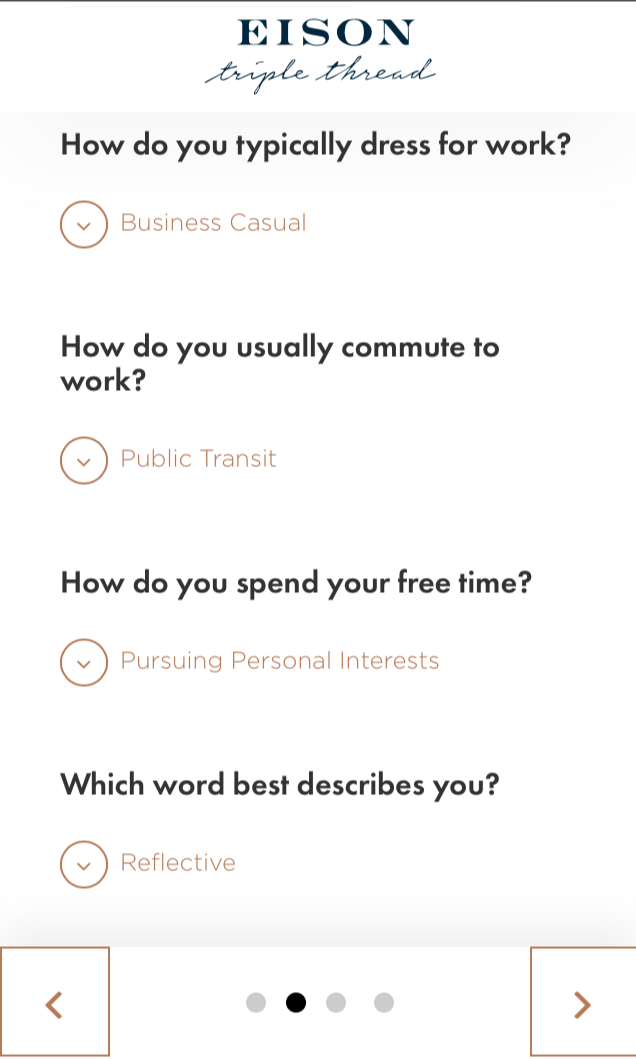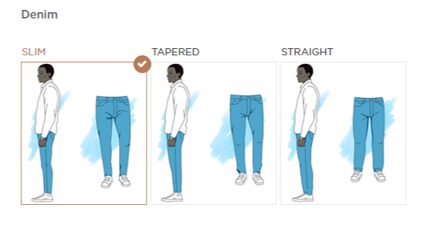 After, I slogged through size and fit preferences for suit jackets, pants, shirts and jeans for which options included slim, tailored or relaxed. I said “slim” to everything.
