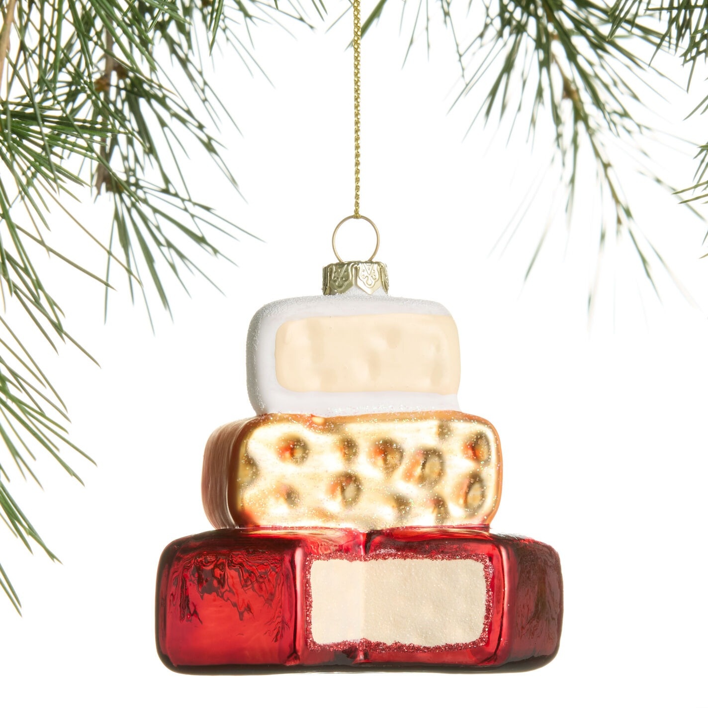 Show the world just how much you love cheese with this glossy, glittery ornament. The stack features depictions of brie, swiss and edam cheeses, all made in glass and handpainted for a chic, high-quality finish.